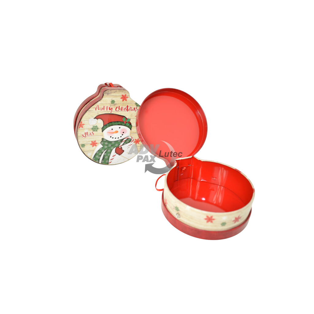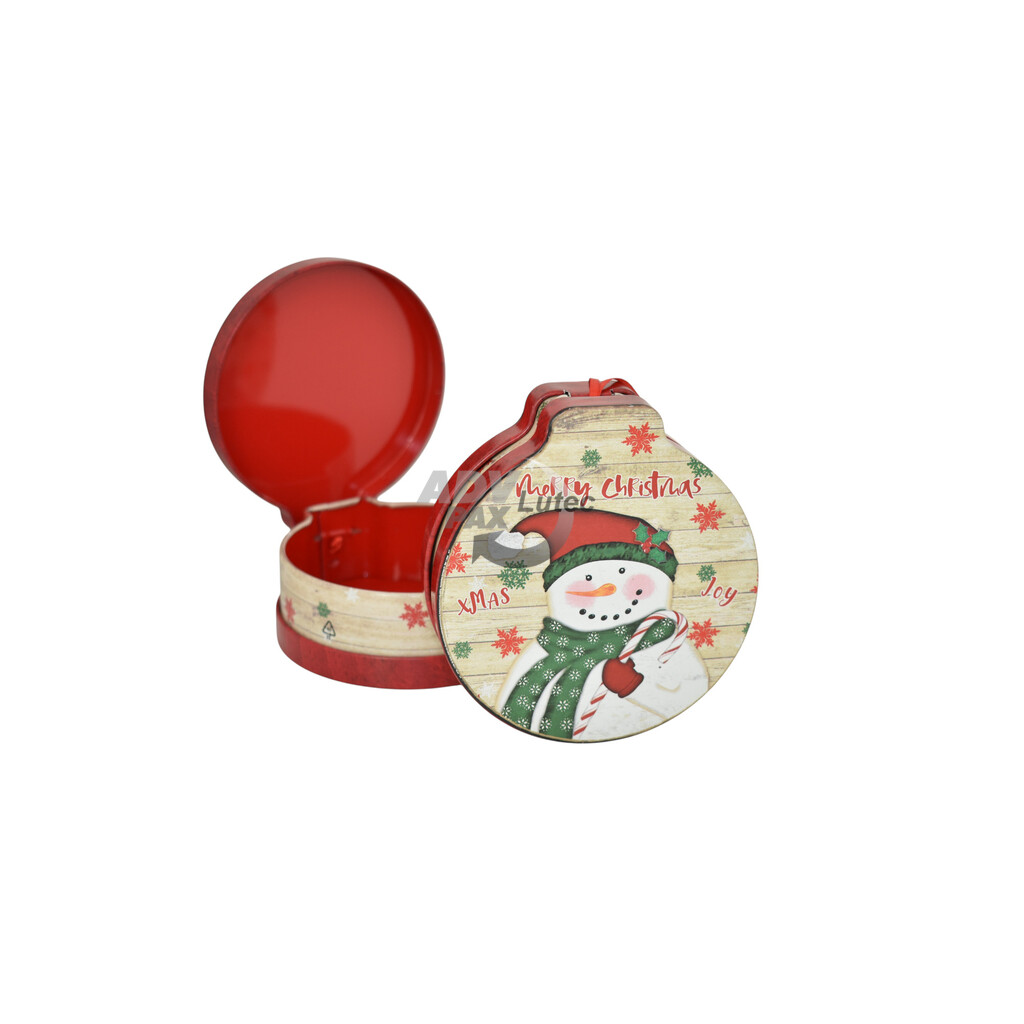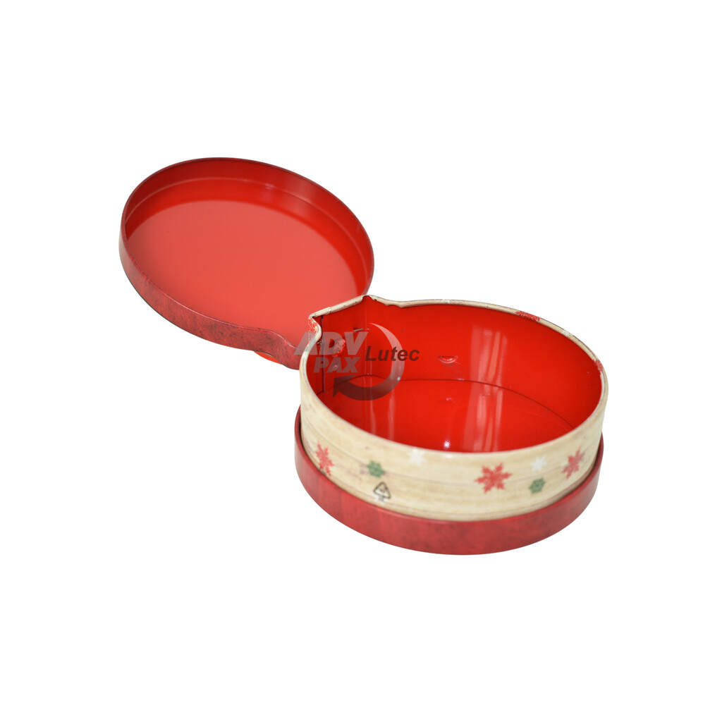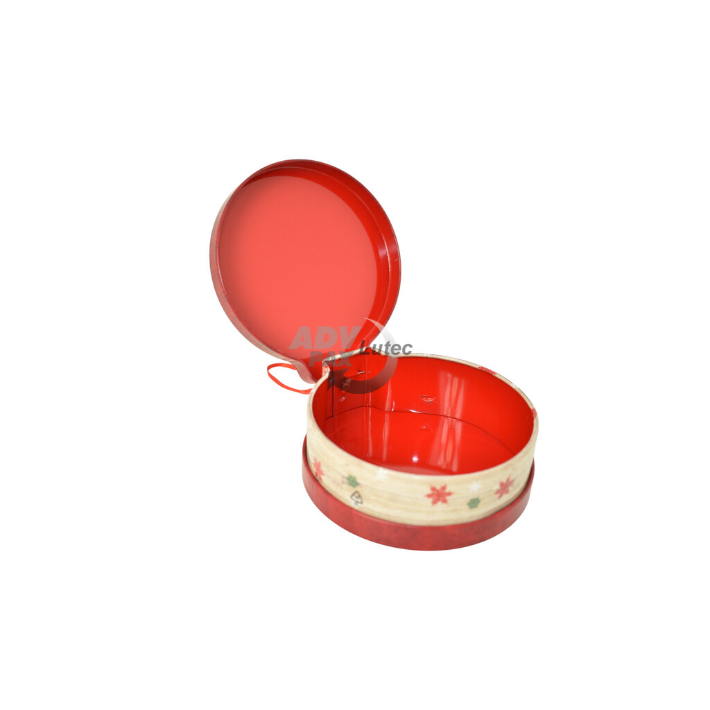 Sonderform Scharnierdeckeldose als flache Kugel aus elektrolytischem Weißblech; bedruckt