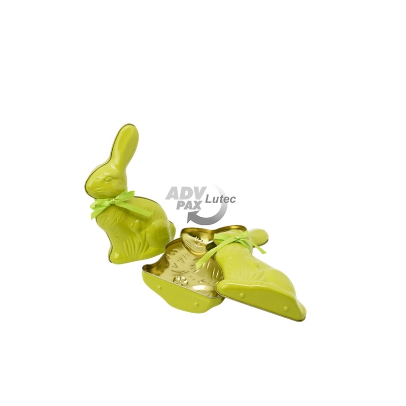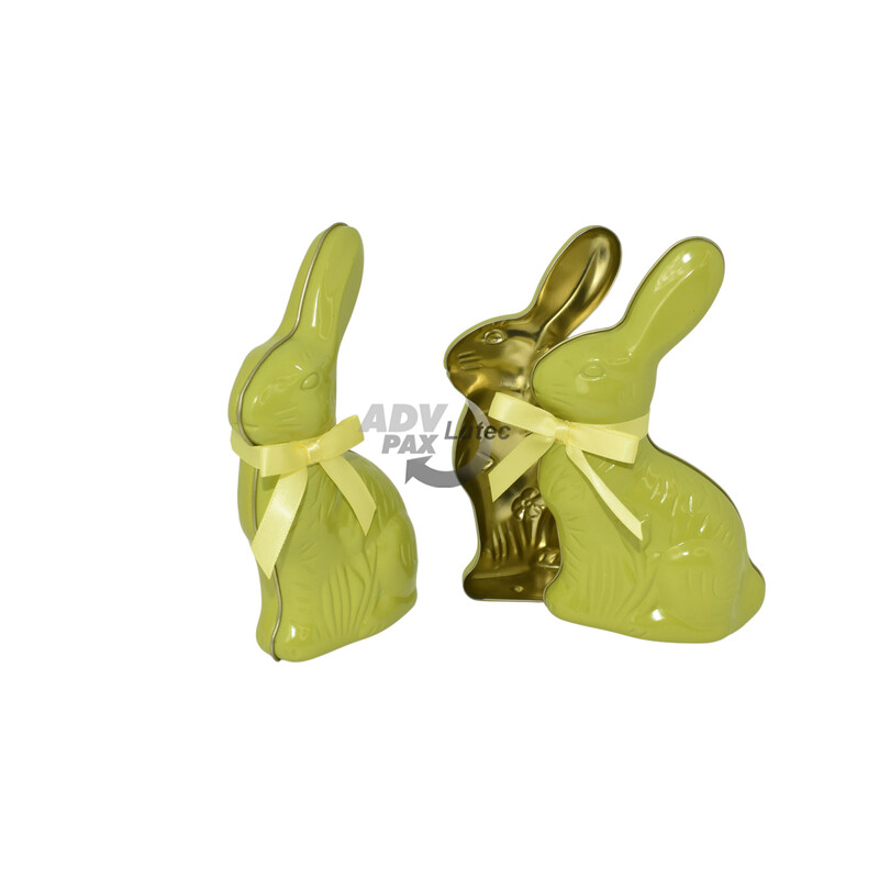 Sonderform Osterhase sitzend; Stülpdeckeldose aus elektrolytischem Weißblech; bedruckt