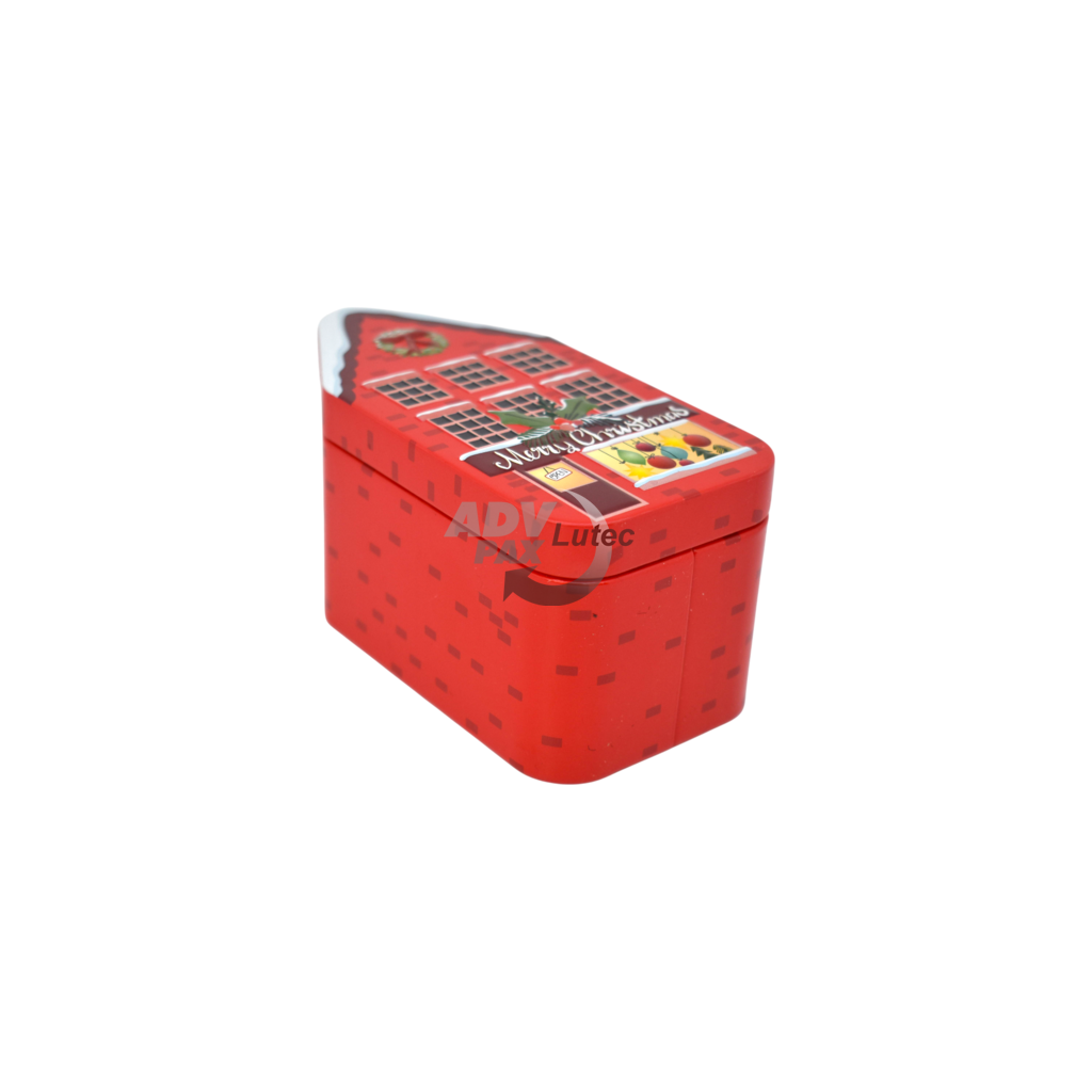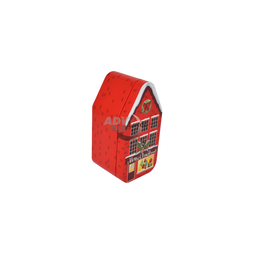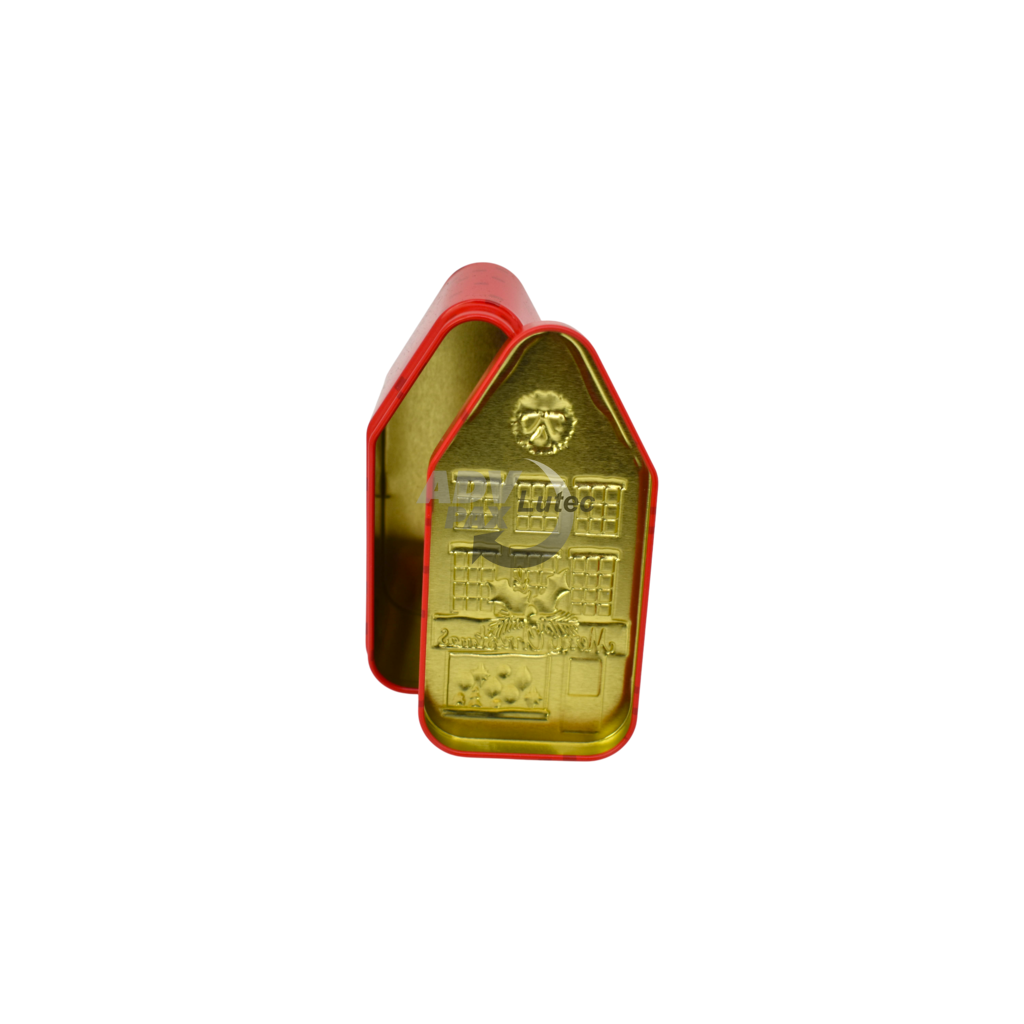 Sonderform Haus; Stülpdeckeldose aus elektrolytischem Weißblech; Abmessung: 124x62x60 mm; bedruckt;