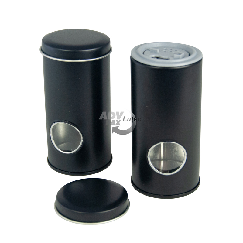 Runde Stülpdeckeldose mit Sichtfenster aus elektrolytischem Weißblech; mit Kunststoffstreueinsatz; schwarz