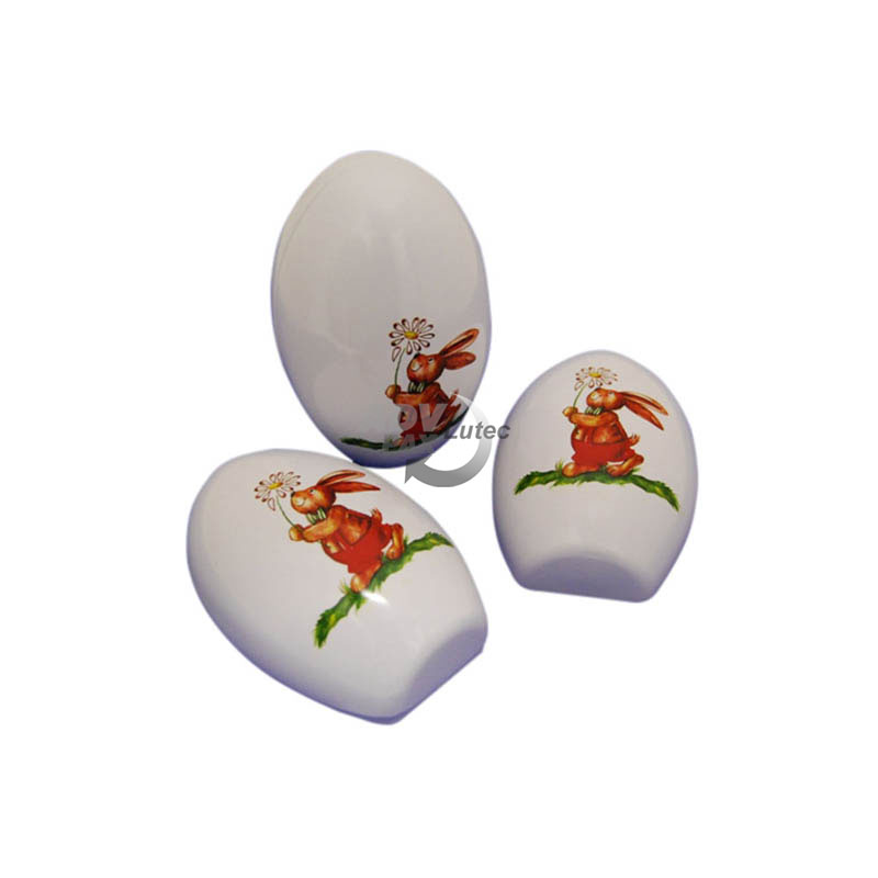 Sonderform stehendes Ei; Stülpdeckeldose aus elektrolytischem Weißblech; Bedruckung: weiß + 4-c (CMYK)