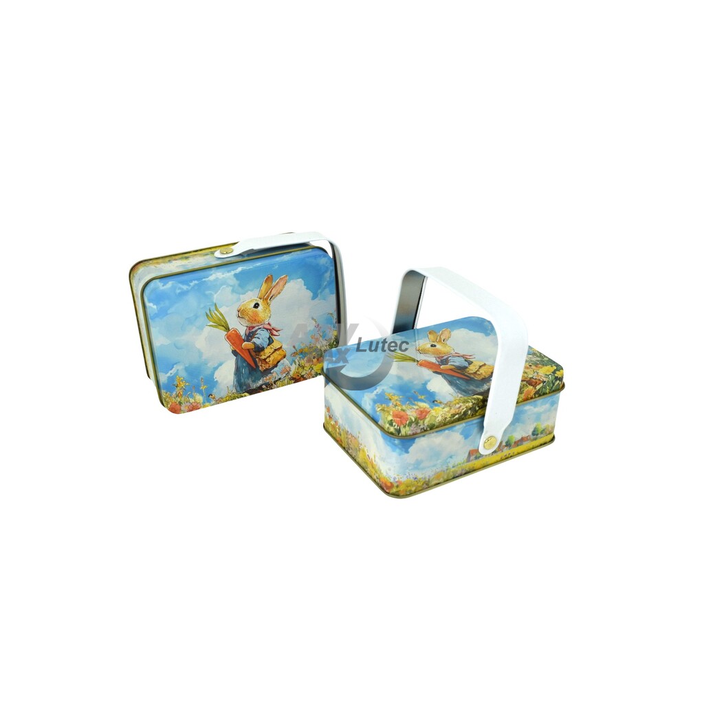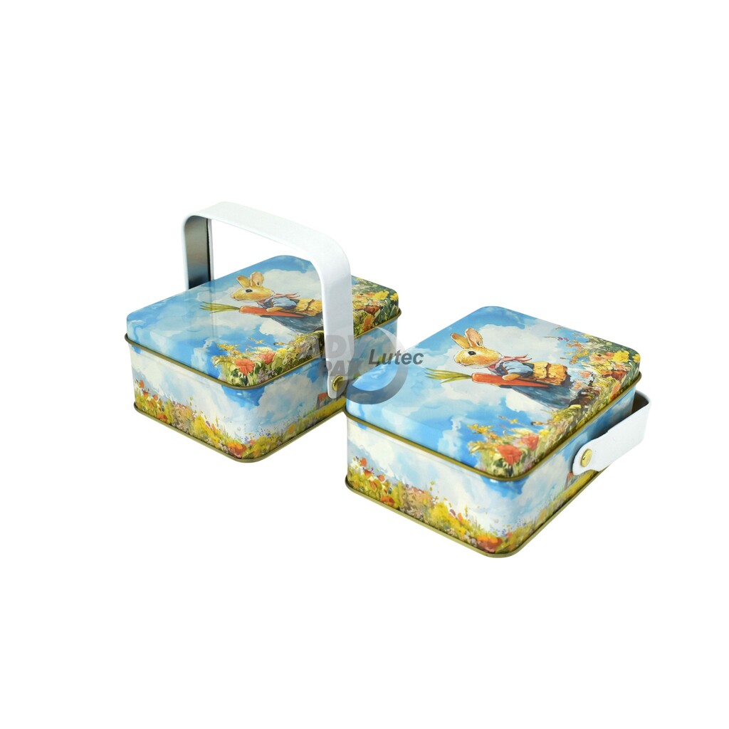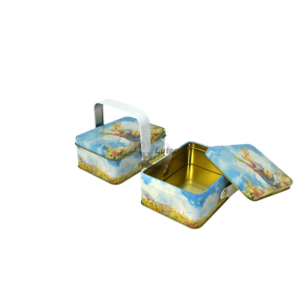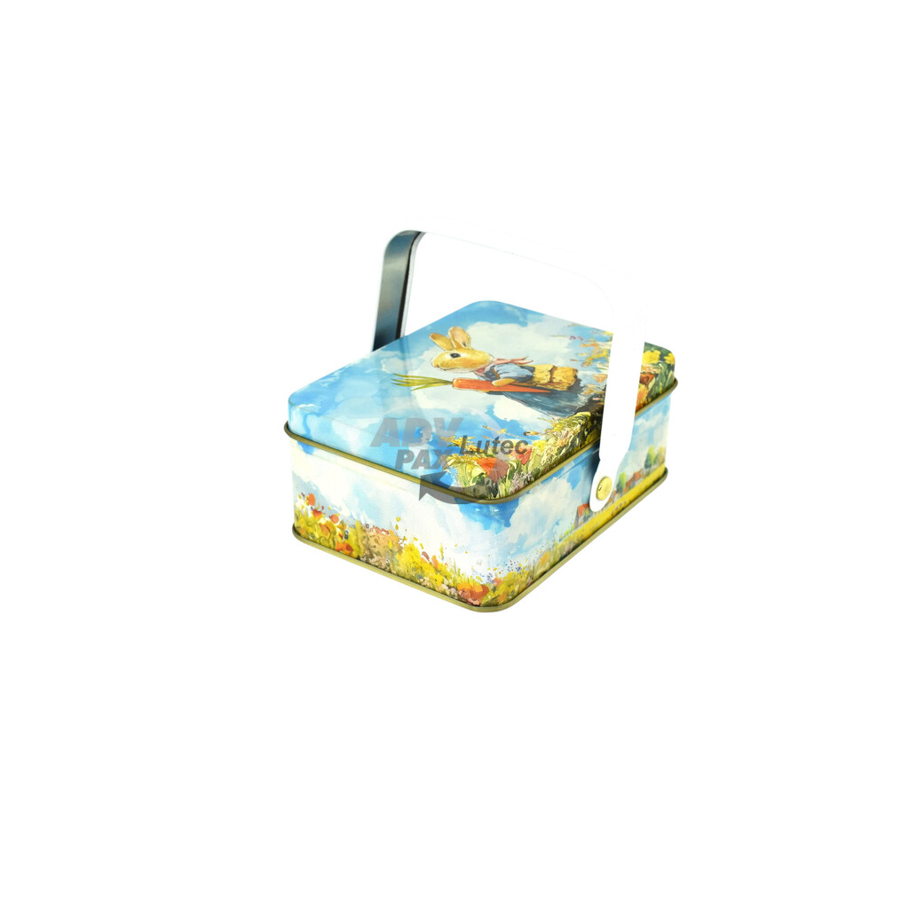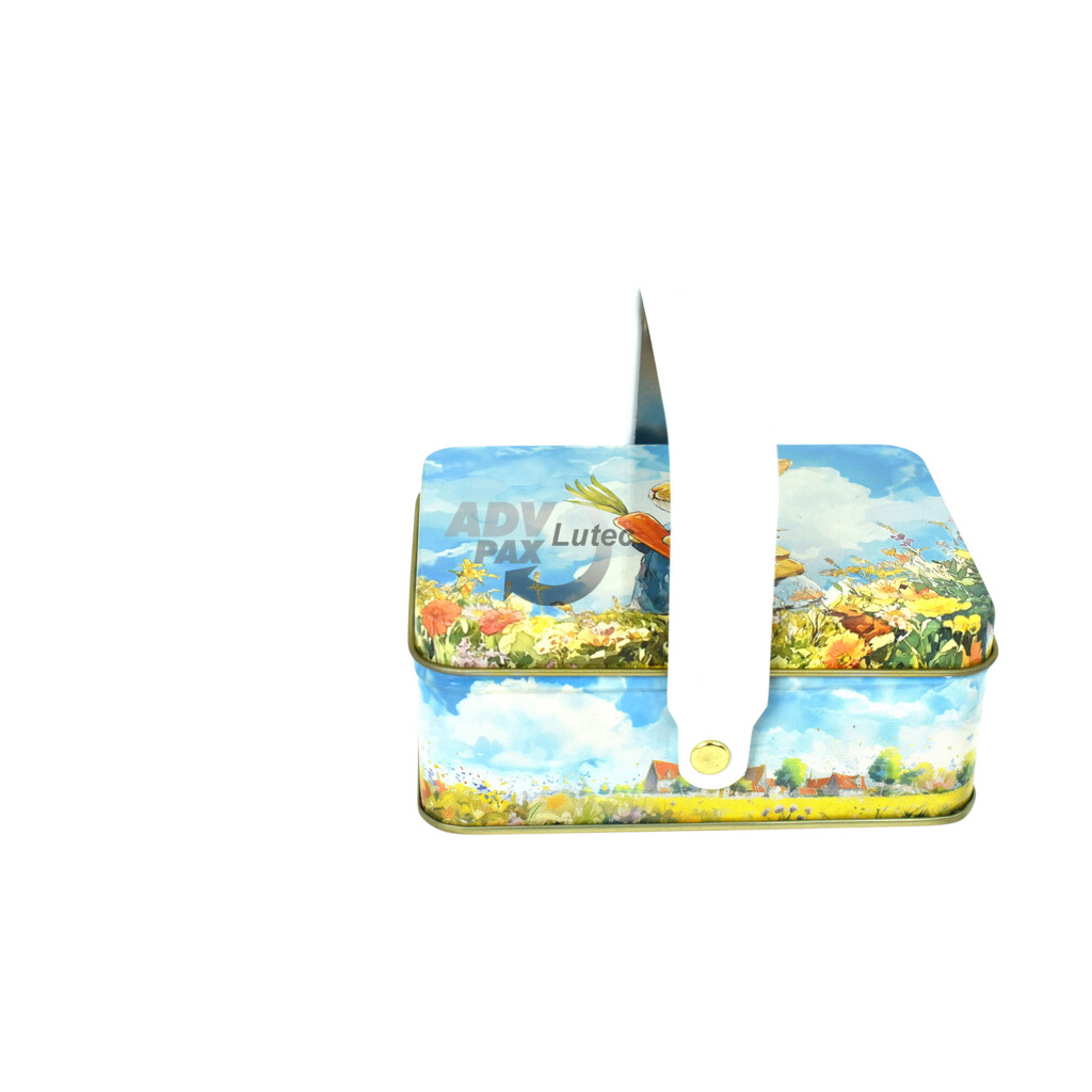 Sonderform Korb; Rechteckige Stülpdeckeldose mit Henkel aus elektrolytischem Weißblech