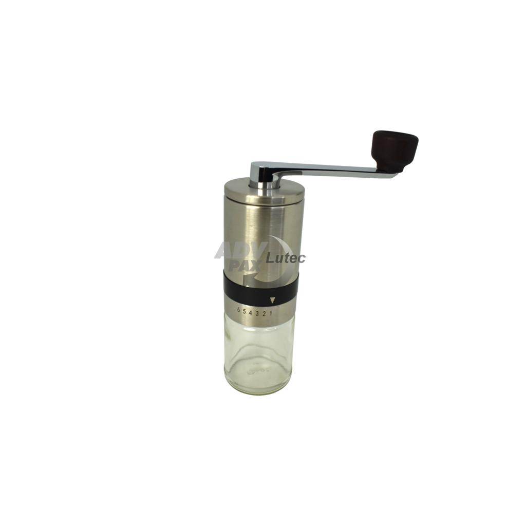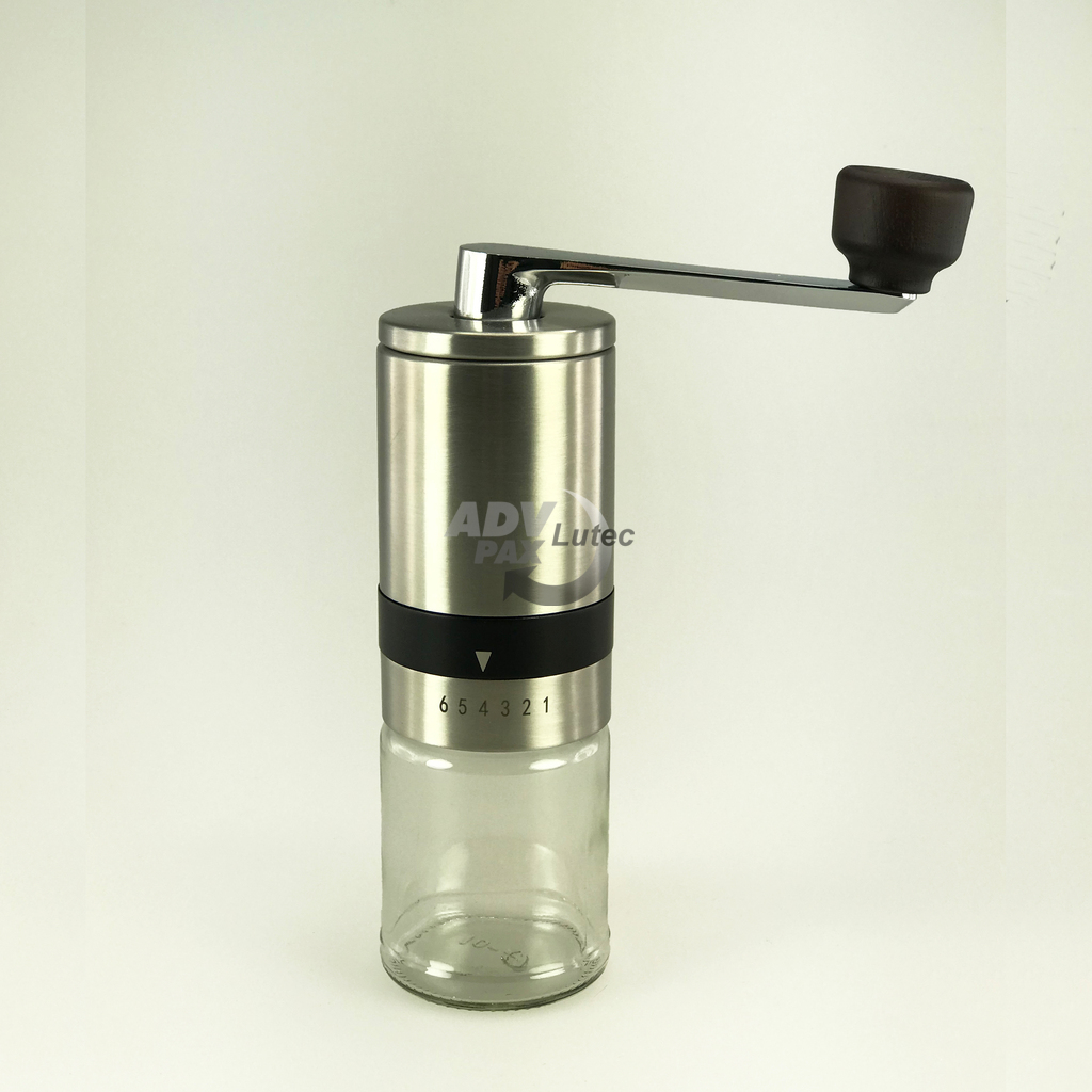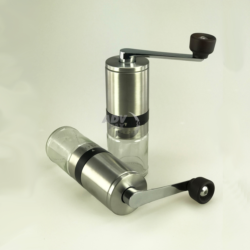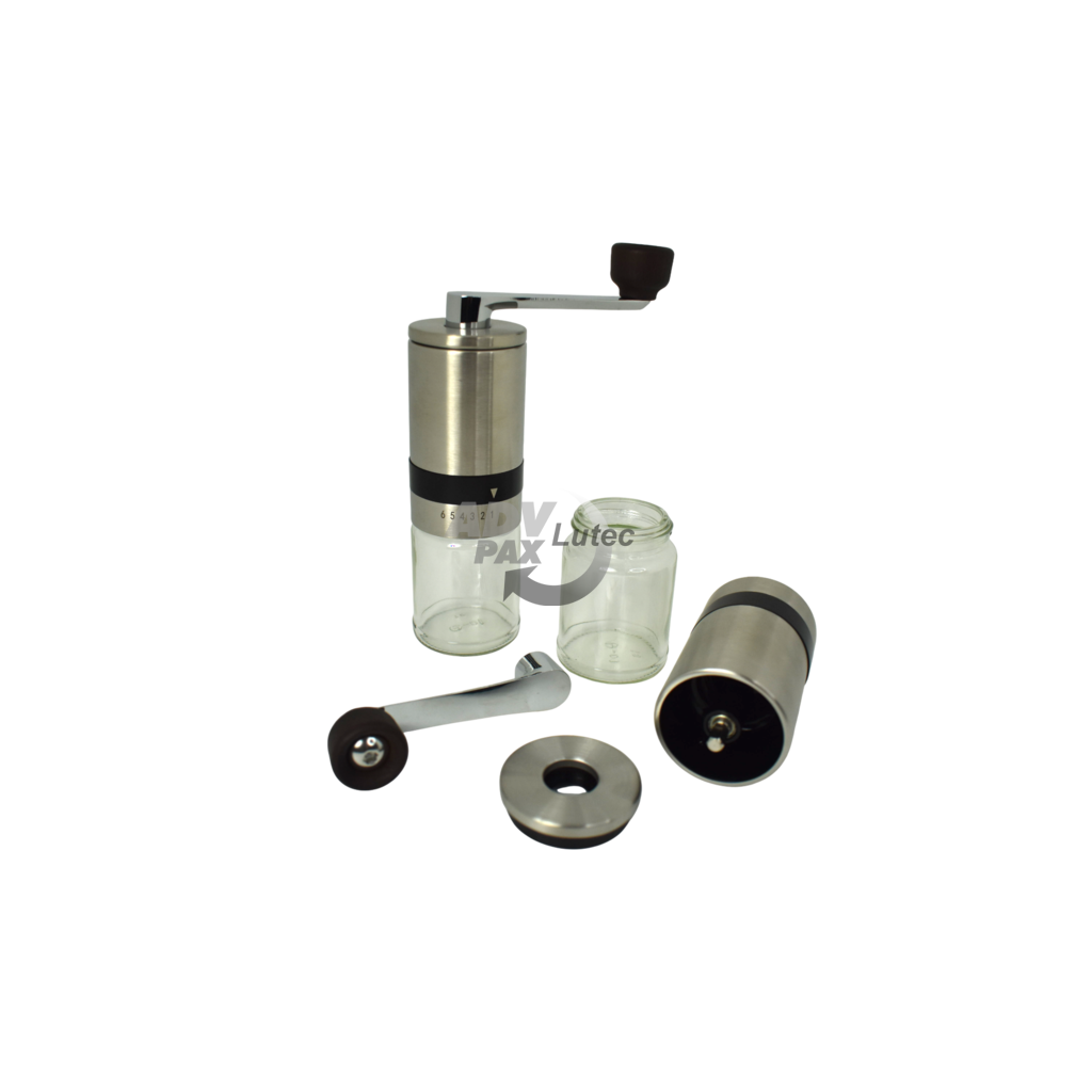 Kaffeemühle mit manuell - verstellbarem Keramikmahlwerk; Oberteil aus Edelstahl; Unterteil aus Glas;