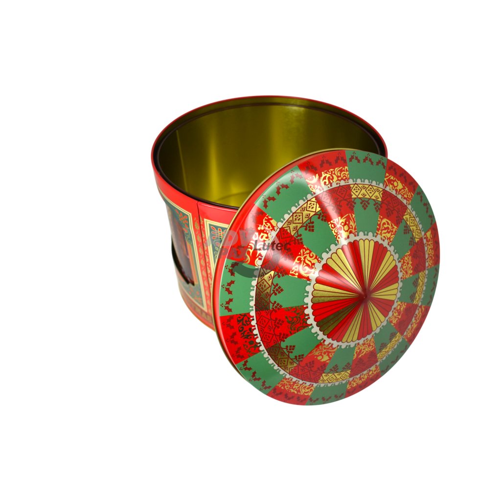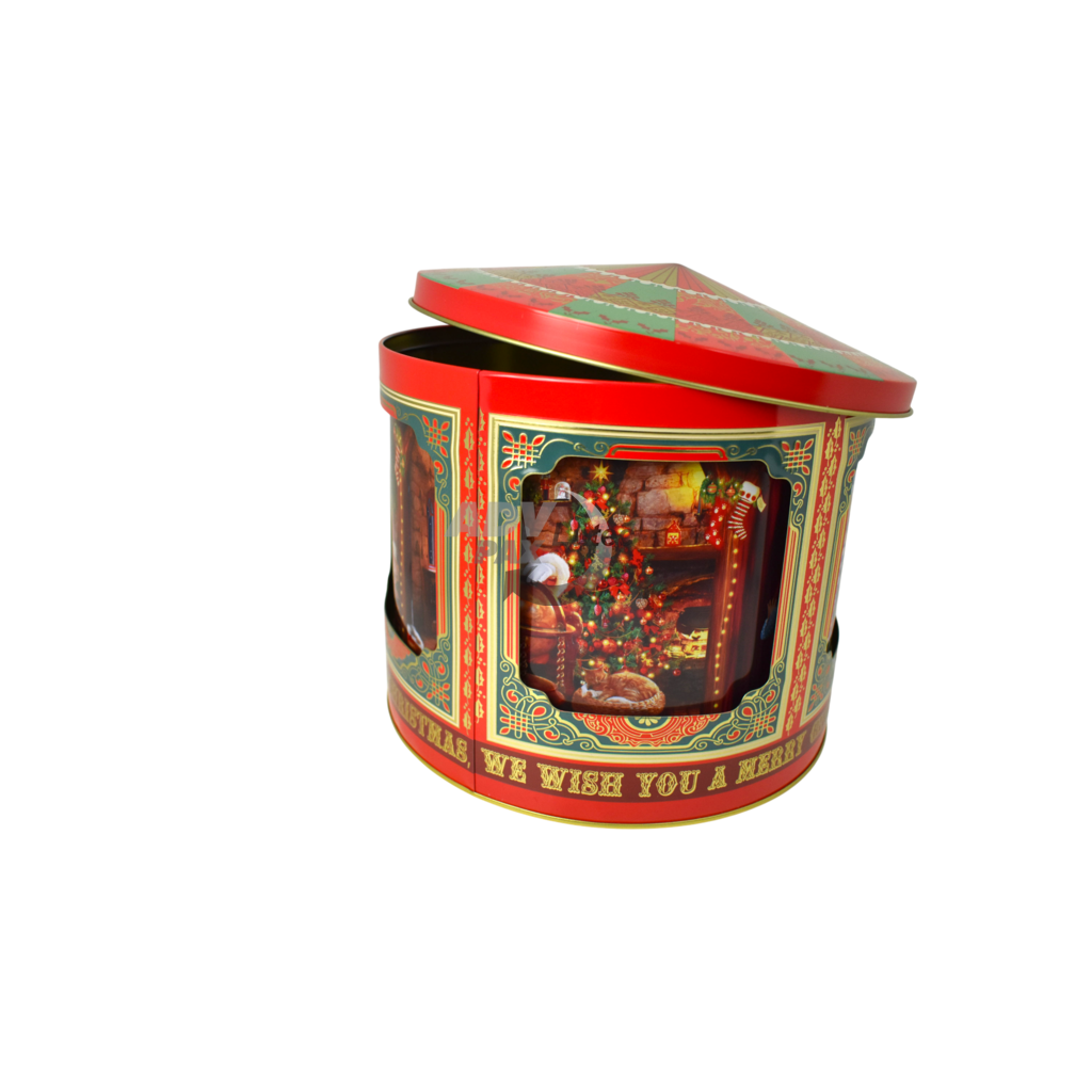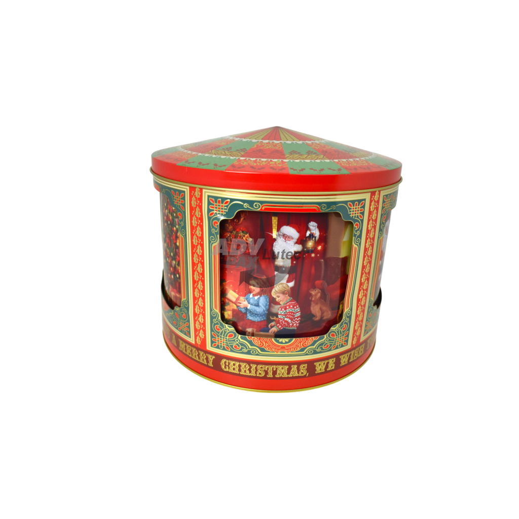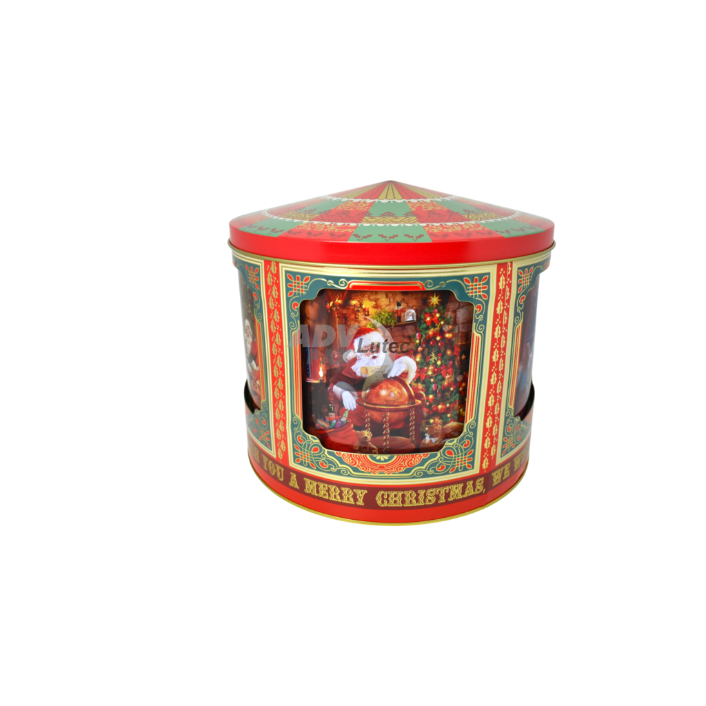 Sonderform Karussell; runde Stülpdeckeldose aus elektrolytischem Weißblech; bedruckt; mit Musikspielwerk, Melodie: Jingle Bells; Dose dreht sich