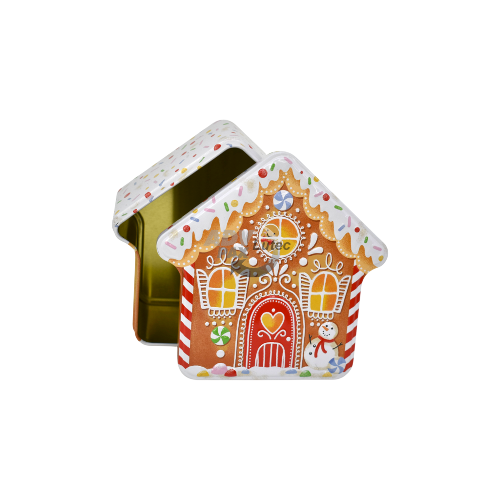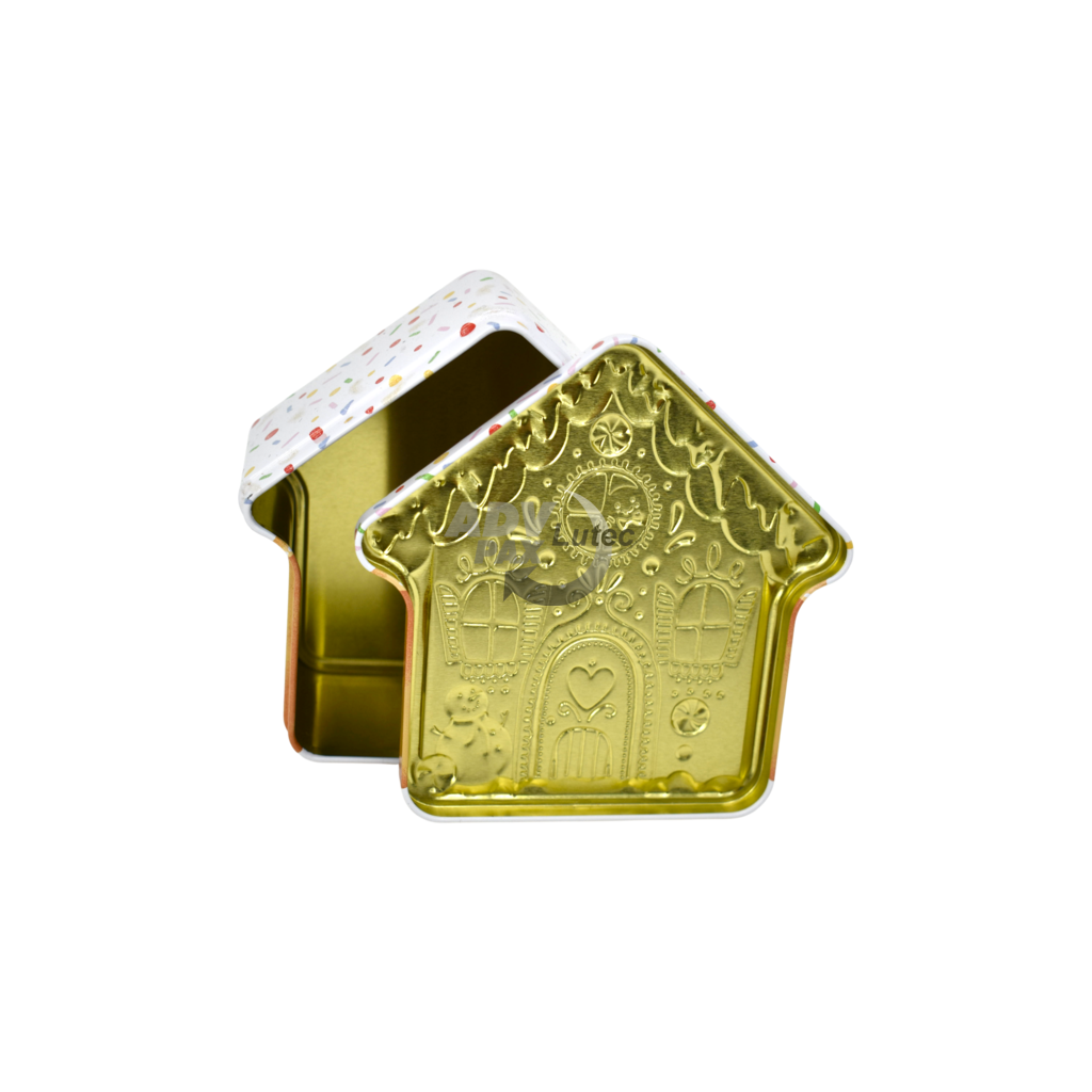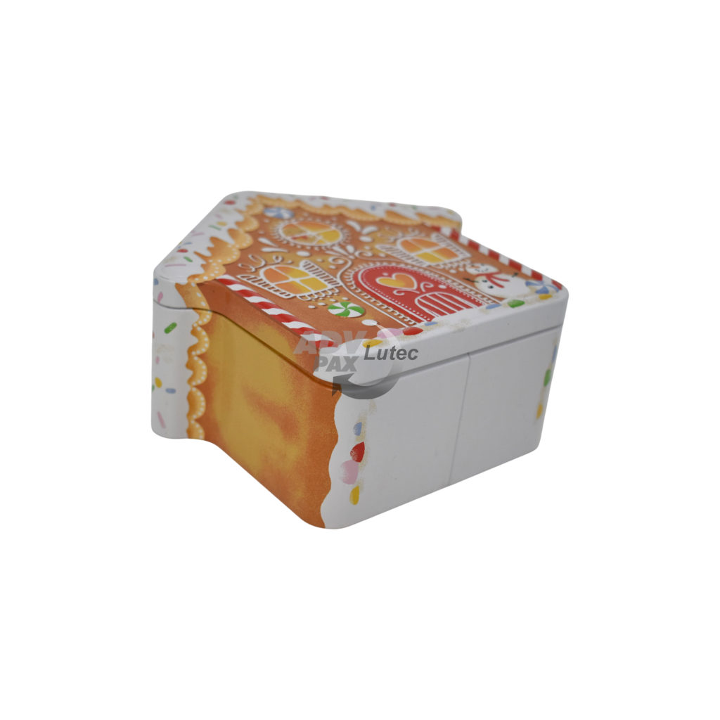 Sonderform Haus; Stülpdeckeldose aus elektrolytischem Weißblech; Abmessung: 135x135x62 mm; bedruckt;