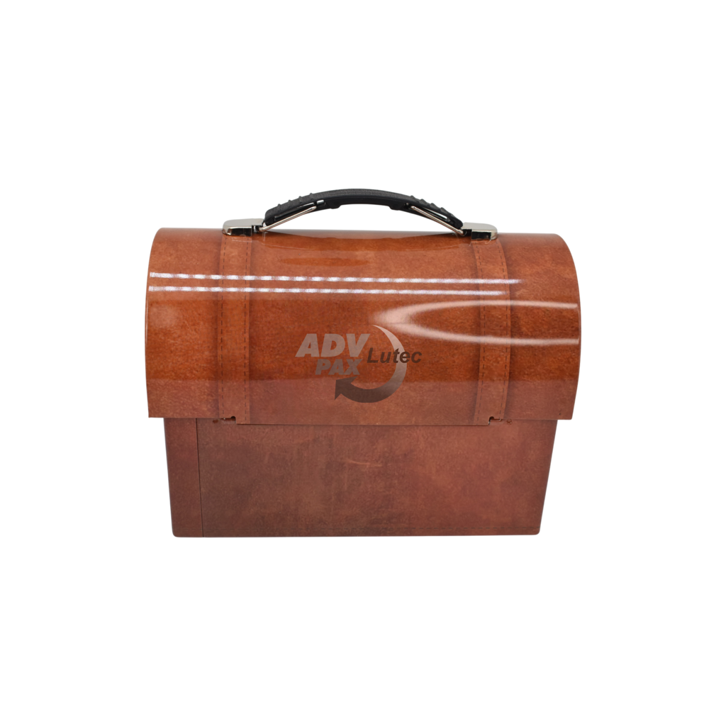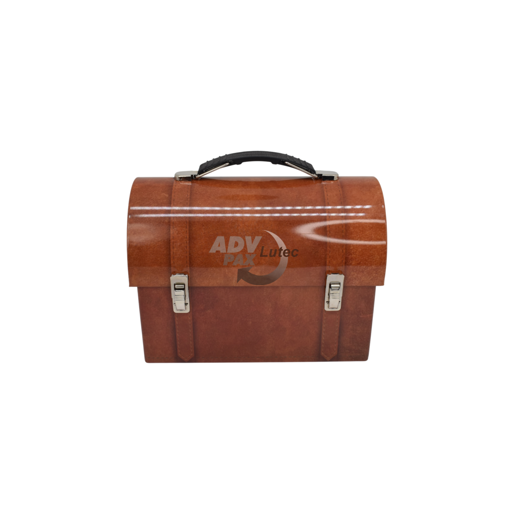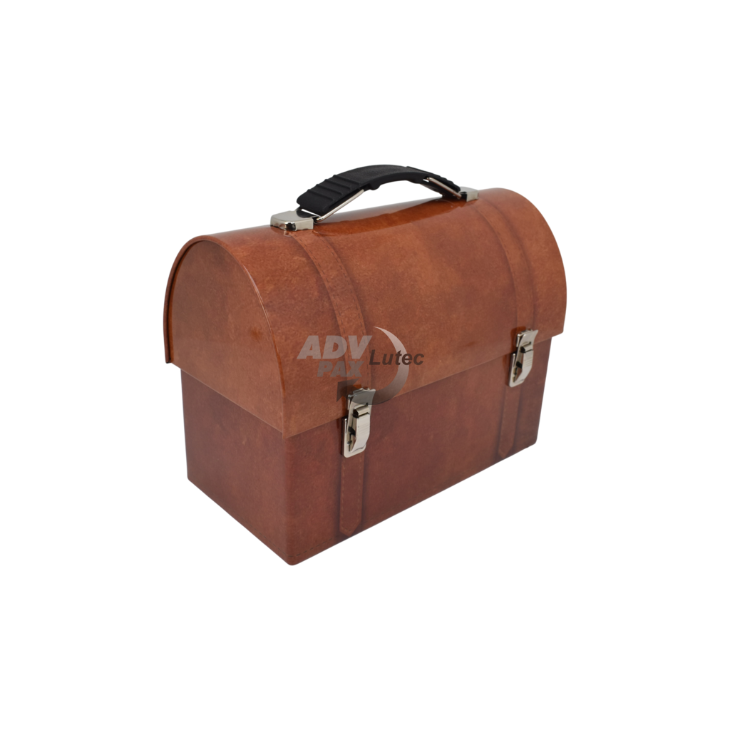 Sonderform Koffer mit Truhendeckel; Rechteckige Scharnierdeckeldose mit Henkel aus elektrolytischem Weißblech; bedruckt