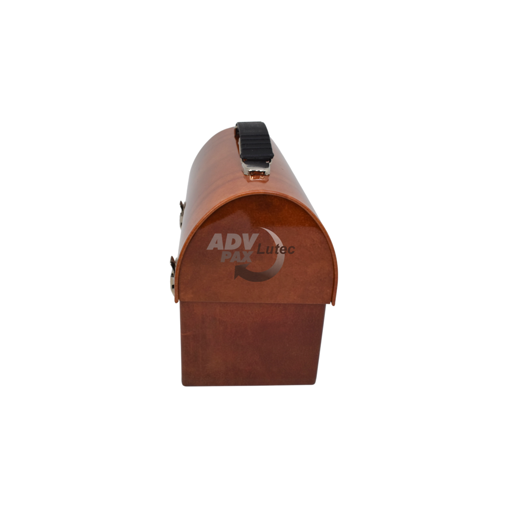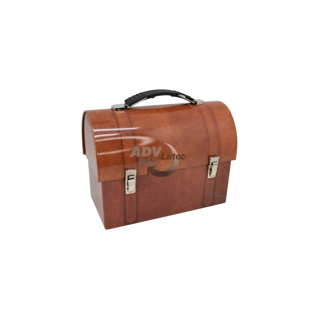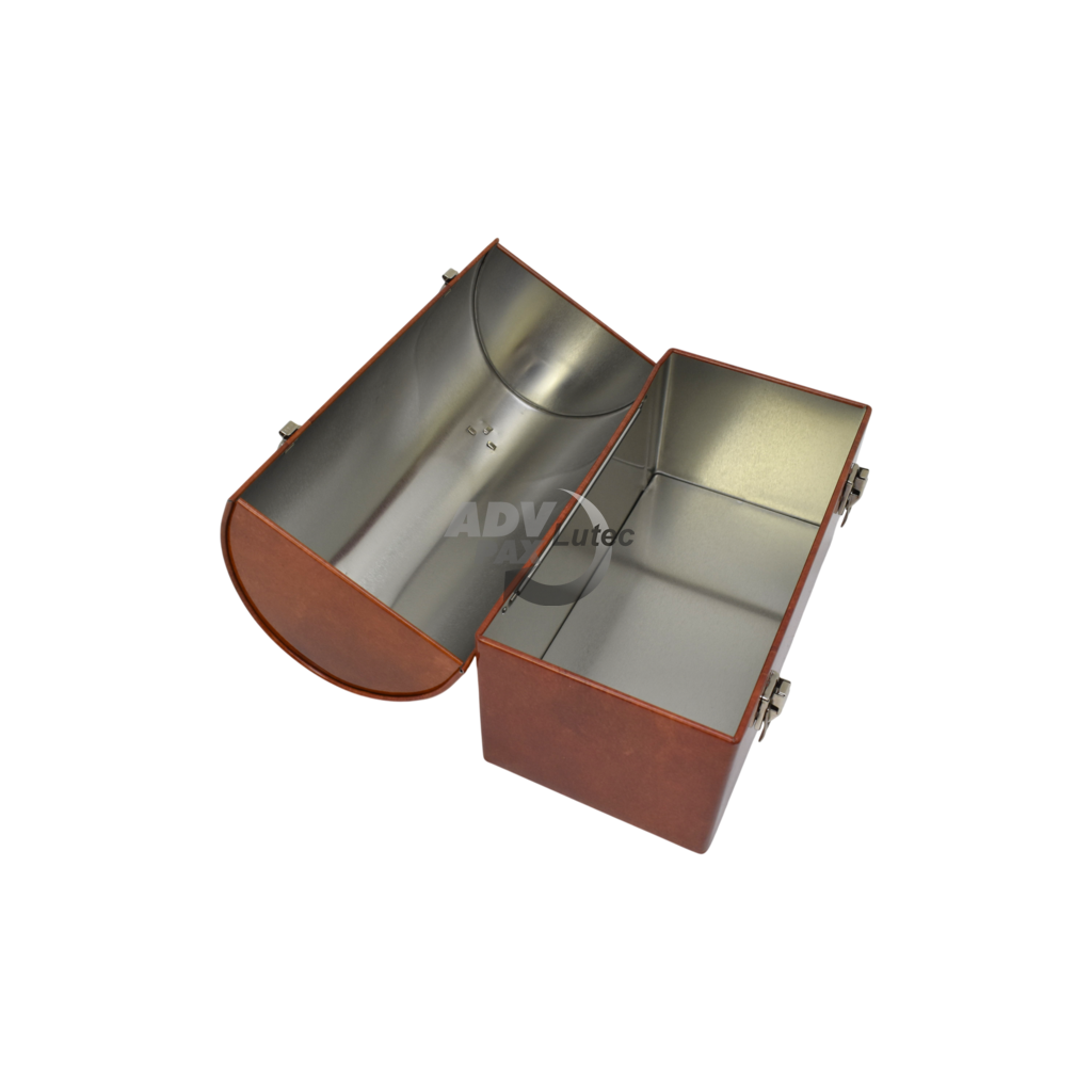 Sonderform Koffer mit Truhendeckel; Rechteckige Scharnierdeckeldose mit Henkel aus elektrolytischem Weißblech; bedruckt