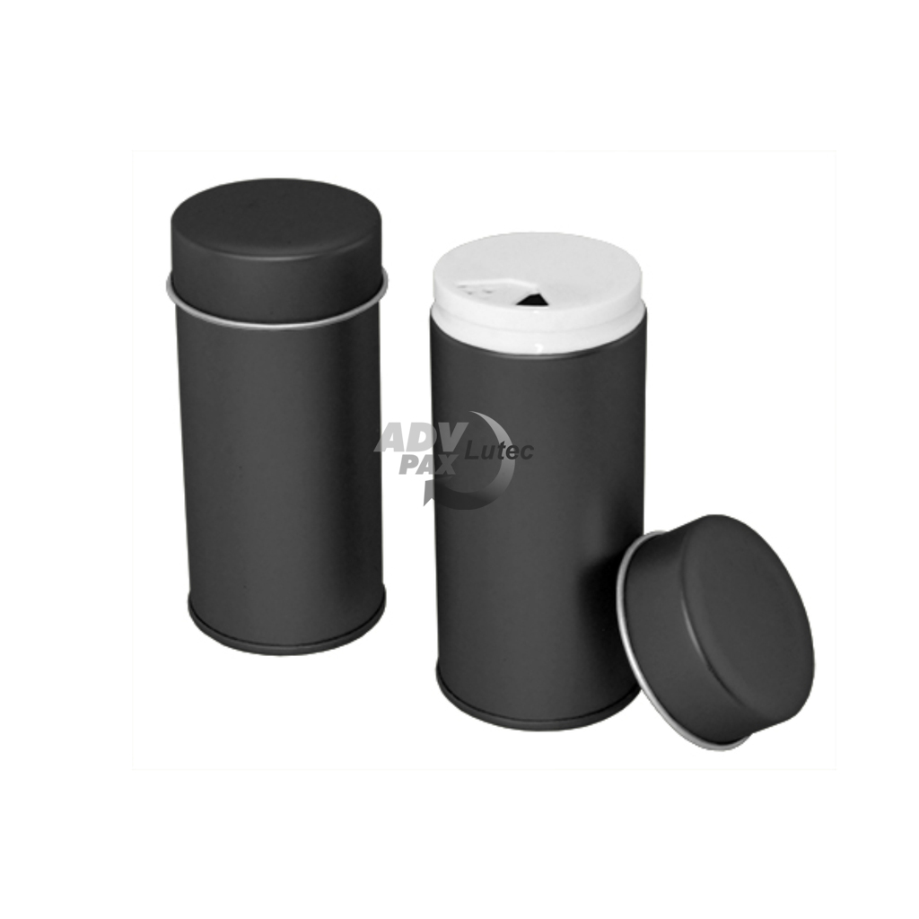 Runde Stülpdeckeldose aus elektrolytischem Weißblech; mit Kunststoffstreueinsatz; schwarz