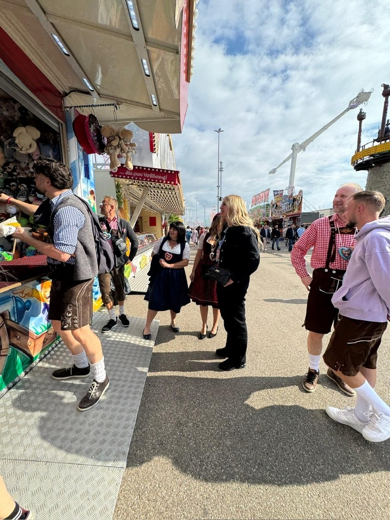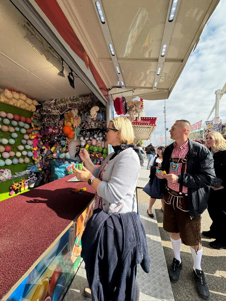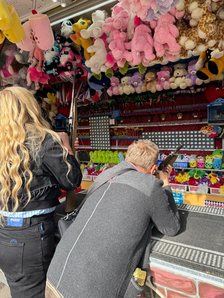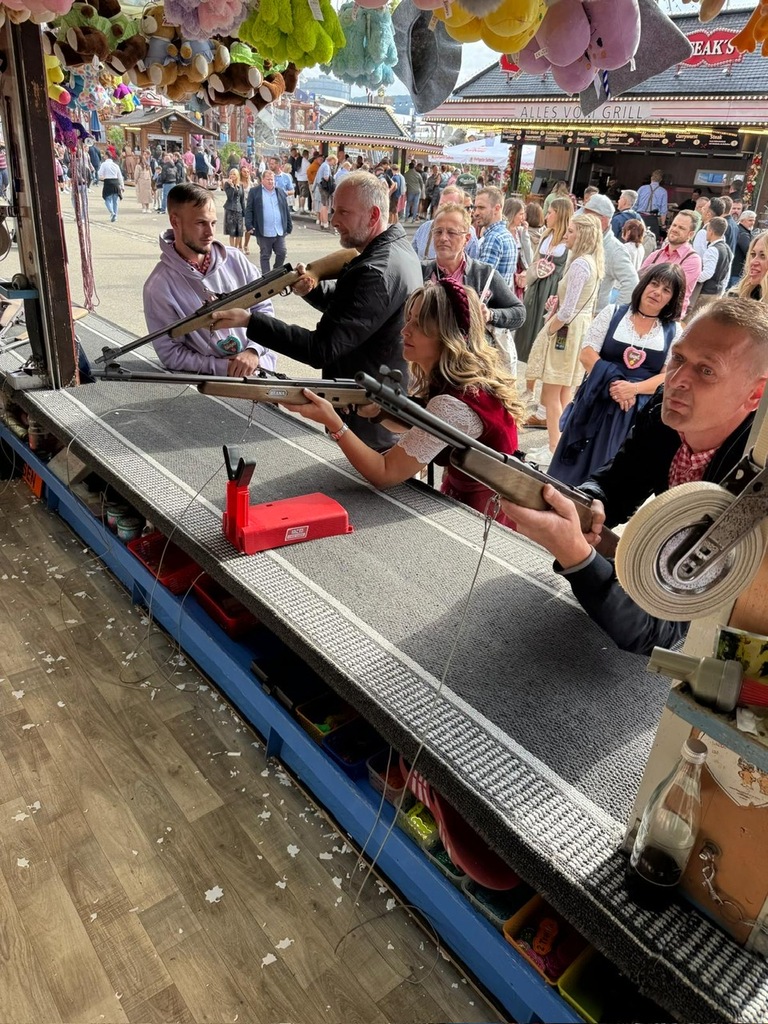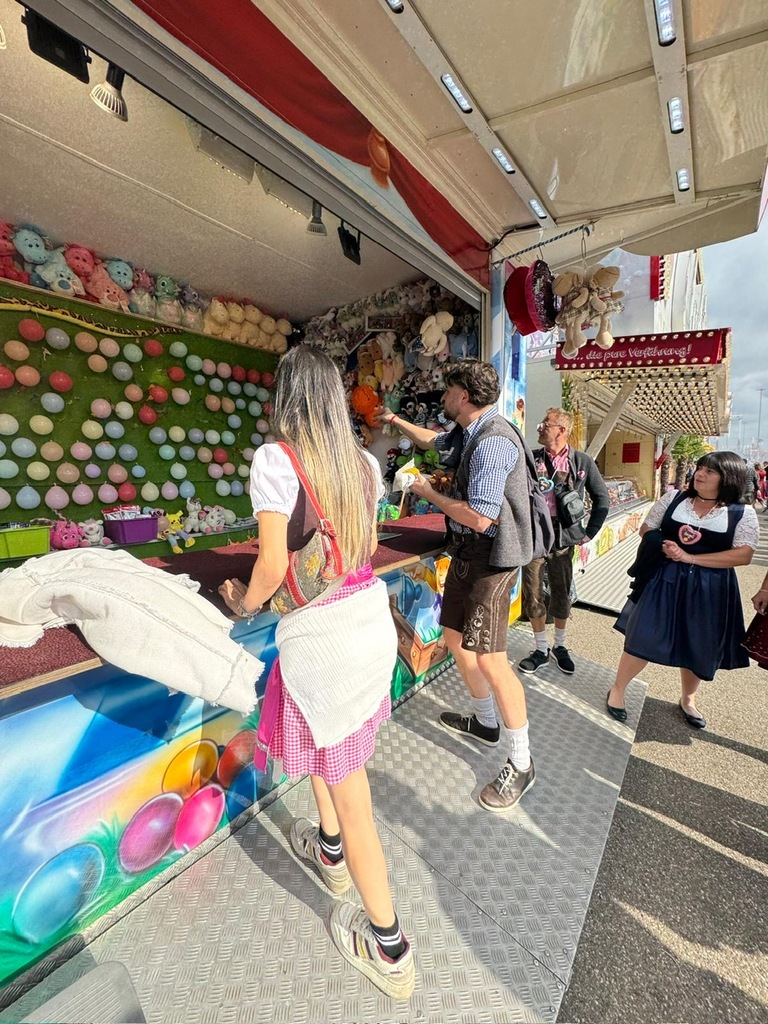Bevor es ins Festzelt ging, genossen wir das bunte Treiben auf dem Wasen in vollen Zügen: Achterbahn fahren, Boxauto, Schießen und natürlich ein paar süße Schokofrüchte durften dabei nicht fehlen. Beim Dosenwerfen mussten wir allerdings feststellen: Wir haben Dosen gesucht, aber keine gefunden – das passiert uns sonst eher selten.