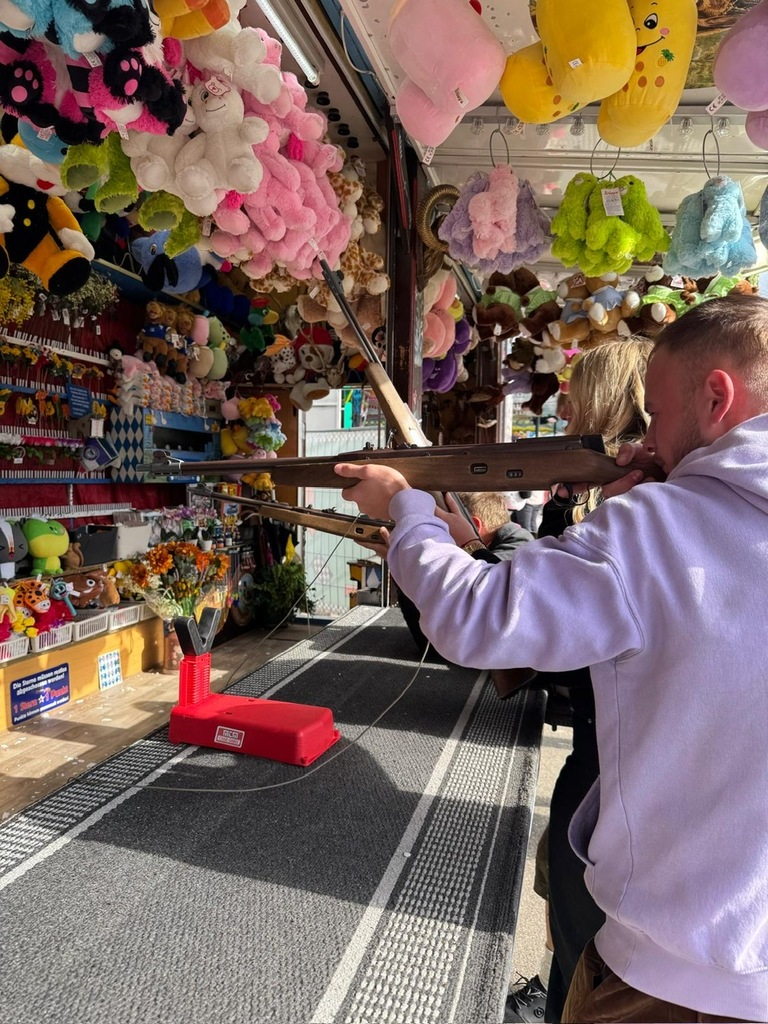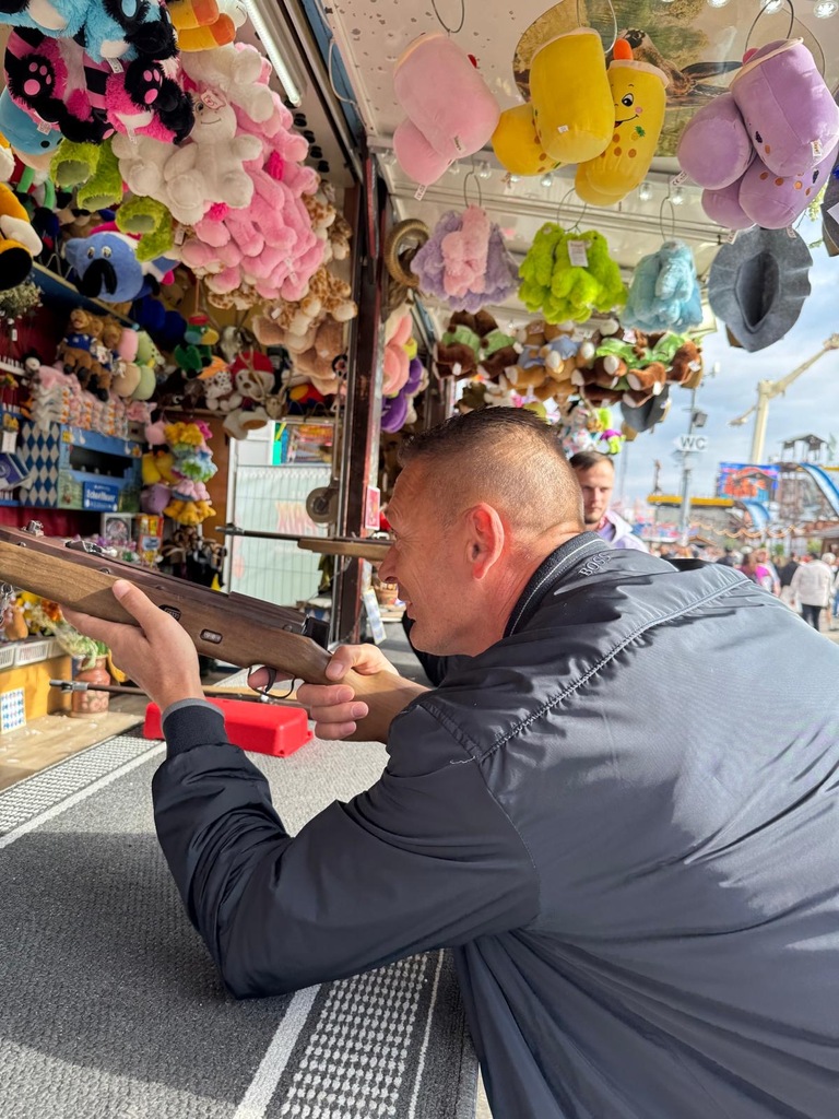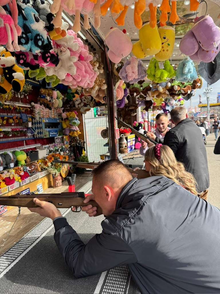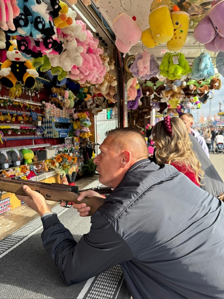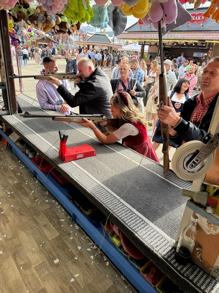 Bevor es ins Festzelt ging, genossen wir das bunte Treiben auf dem Wasen in vollen Zügen: Achterbahn fahren, Boxauto, Schießen und natürlich ein paar süße Schokofrüchte durften dabei nicht fehlen. Beim Dosenwerfen mussten wir allerdings feststellen: Wir haben Dosen gesucht, aber keine gefunden – das passiert uns sonst eher selten.