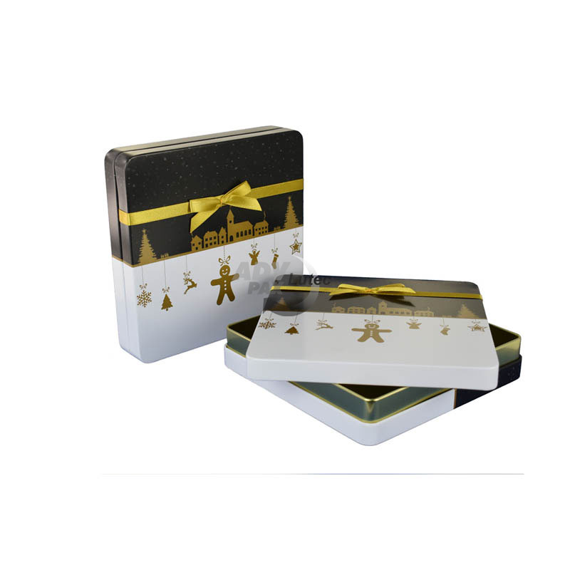 Quadratische Stülpdeckeldose aus elektrolytischem Weißblech; mit echter Schleife; bedruckt
