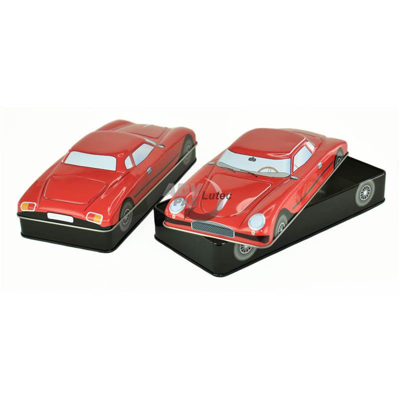 Sonderform Auto; Stülpdeckeldose aus elektrolytischem Weißblech; Bedruckung: weiß + 4-c (CMYK)