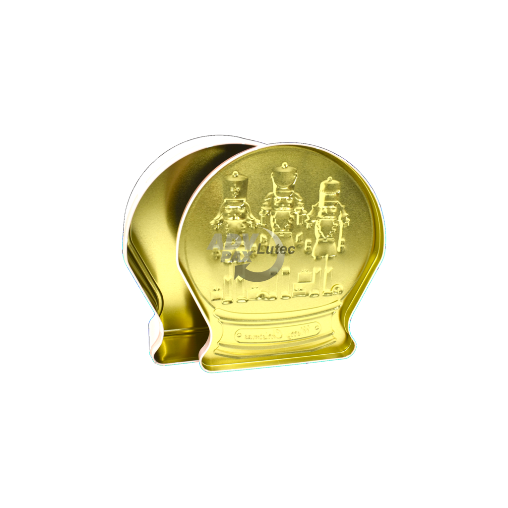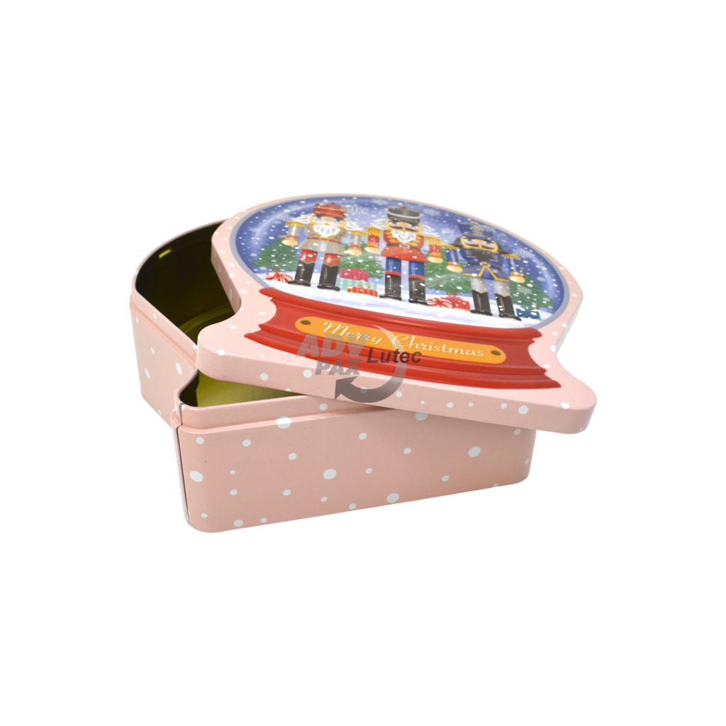 Sonderform Schneekugel Stülpdeckeldose aus elektrolytischem Weißblech; Abmessung: 190x172x59 mm; bedruckt;